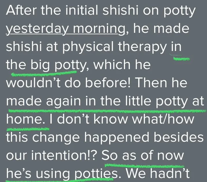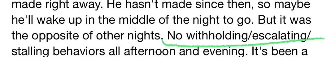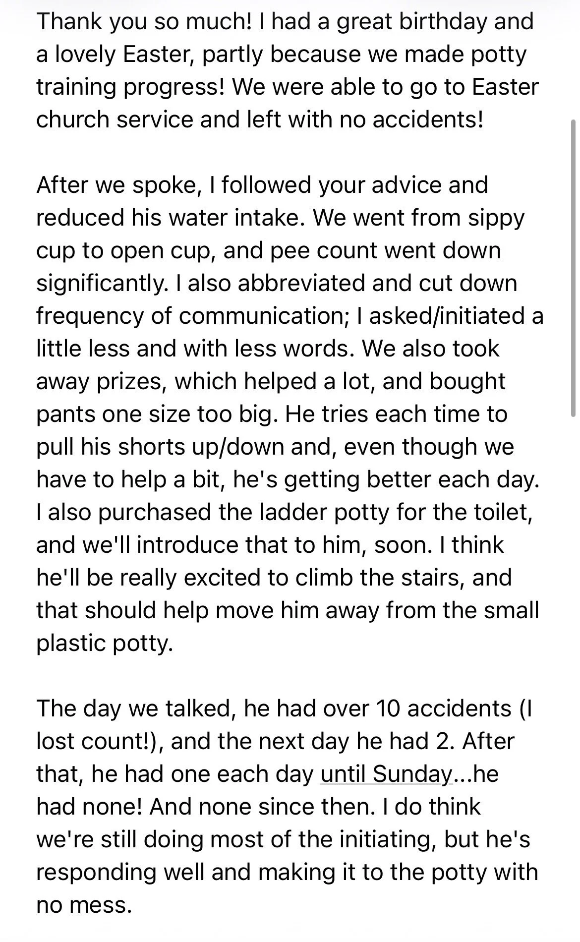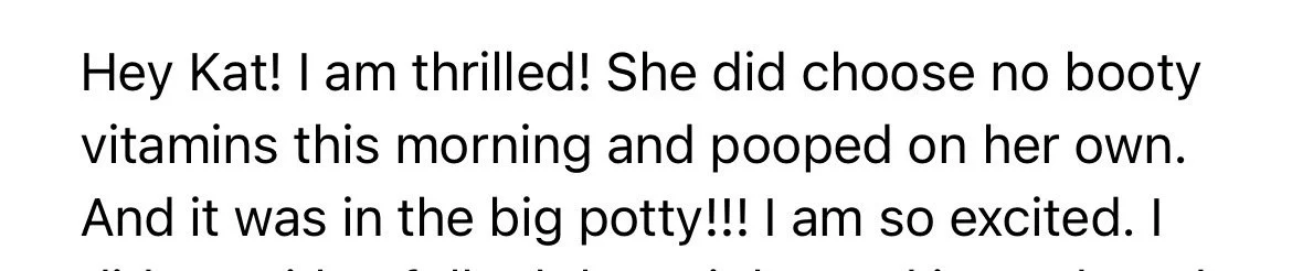 “I left our consult feeling not only confident in my next steps but also excited to begin. Kat has a way of speaking clearly and outlining the steps so that you fully understand while also listening to your unique concerns as they relate to your family and child’s temperament. I was a bit nervous to admit my son was only 17 months old, as I had been met with backlash before about potty training him “too early," but Kat reassured me that the sweet spot for potty training him was right around the corner. My intuition was in fact correct for feeling like I wanted to begin as soon as possible. Kat let me know multiple times that she would stay by my side throughout this process in order to troubleshoot and work through any kinks. I would highly recommend her to anyone who was like me and didn’t even know where to begin.”