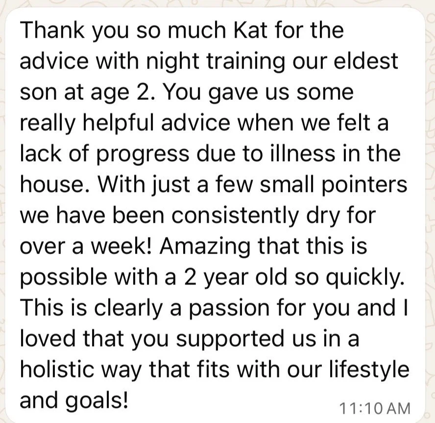 “We started potty training our three-year-old earlier this year, but after dealing with a lot of accidents, we gave in and put her back in pull-ups, which ended up causing a full regression. Feeling totally stuck, we reached out to Kat for a consultation, and we’re so glad we did. She shared so many helpful, practical strategies that we could start using right away. We couldn’t believe how much value we got out of just one hour with her. Kat quickly spotted that we were mostly on the right track but needed a few simple tweaks and those small changes are already making such a big difference. She also gave us the confidence and tools to start night training, which we had been putting off. If you’re struggling with potty training, we can’t recommend Kat enough. Her advice goes way beyond the well-meaning tips you get from friends or family. Every child is different, and Kat really understands how to meet kids (and parents!) where they’re at.”