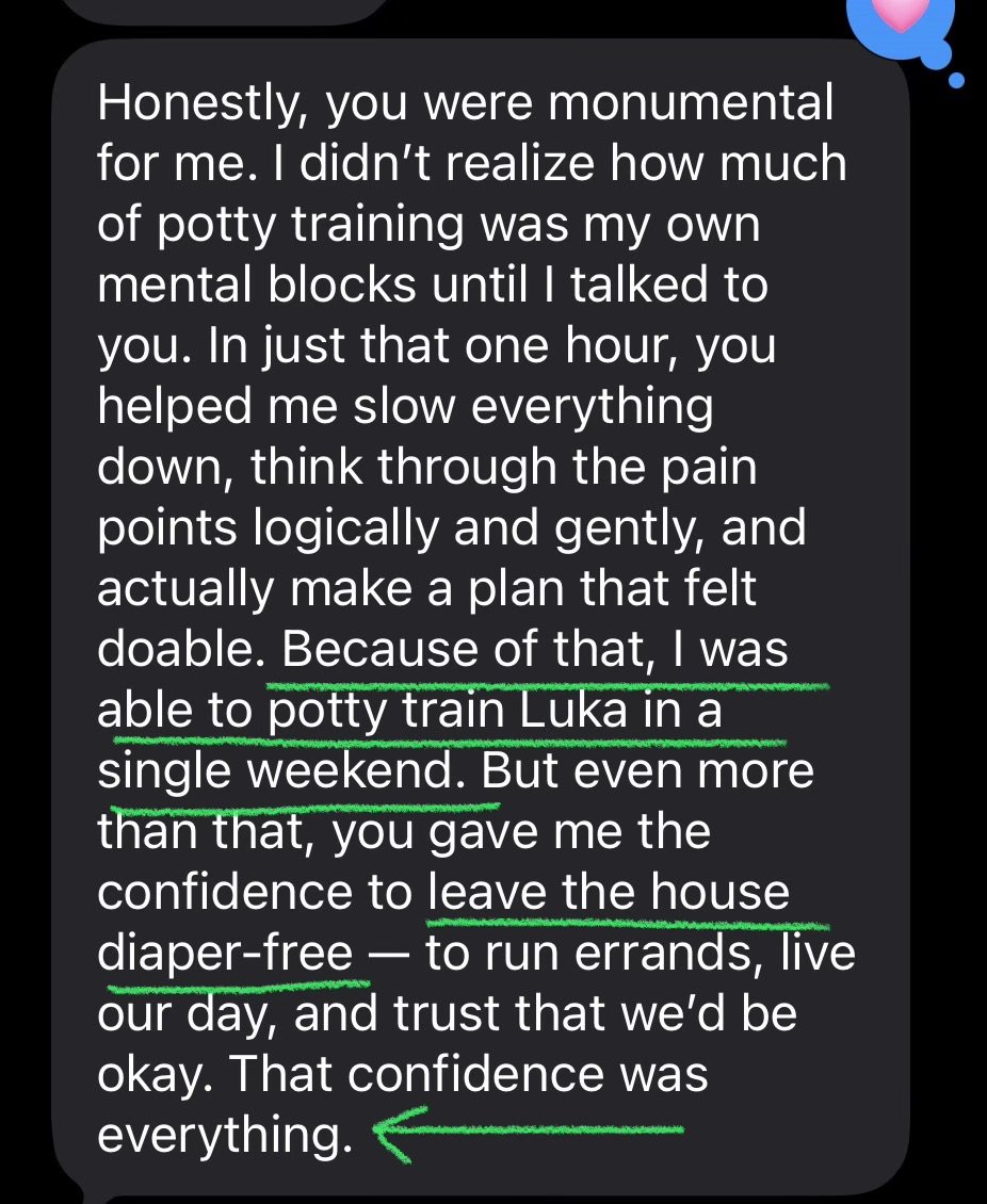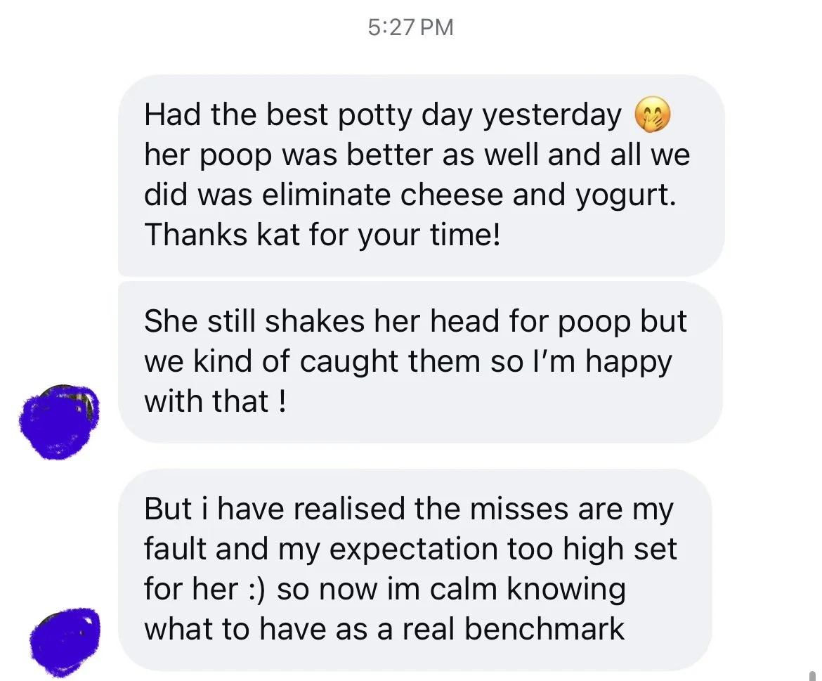 She shared so many insightful pointers, things my husband and I would’ve never thought of, and we deeply respect her straightforward approach. This is not your typical mainstream potty training method that often leads to frustration and setbacks. Kat guided us through a much more rewarding journey.”
