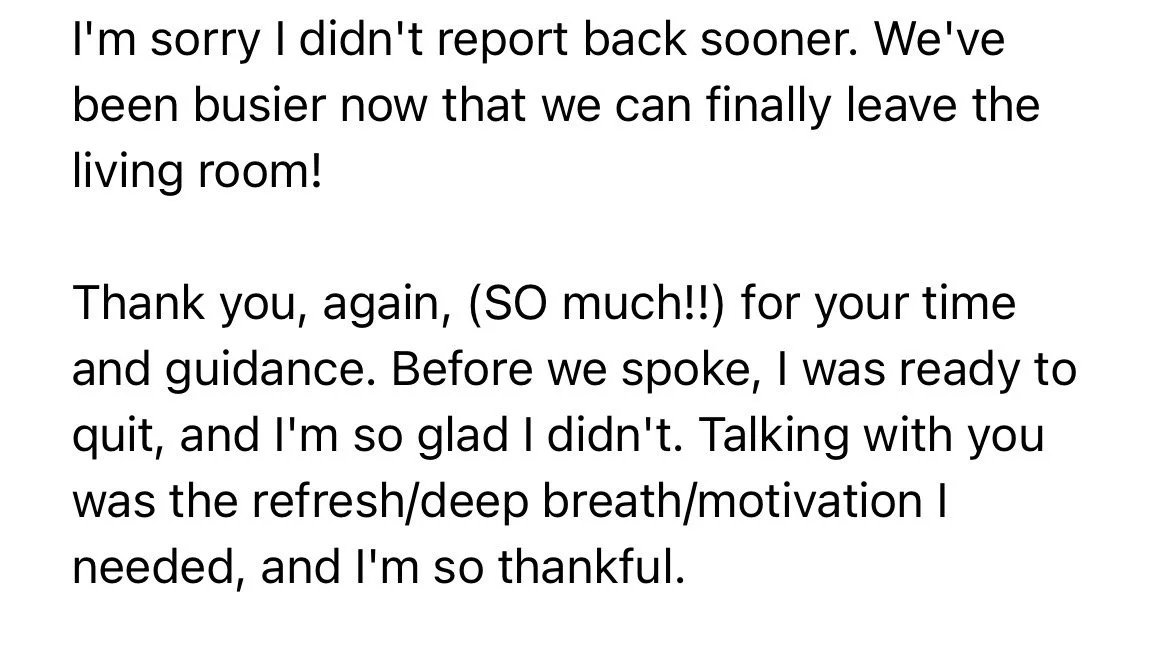 “Working with Kat was an absolute game changer for our family! She walked us through all the do’s and don’ts, helping us develop a realistic plan to approach our second round of potty training with consistency.